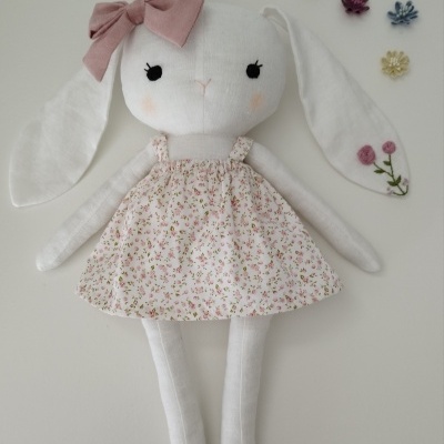 Feita em tecido de algodão, vestida com linda saia e roupa interior, esta coelhinha é a companhia mais doce para qualquer menina, para além de ser uma peça de decoração encantadora.