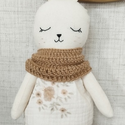 Totalmente feita à mão, inclusive os detalhes delicados da face, que são bordados, e o cachecol que é feito em crochet.