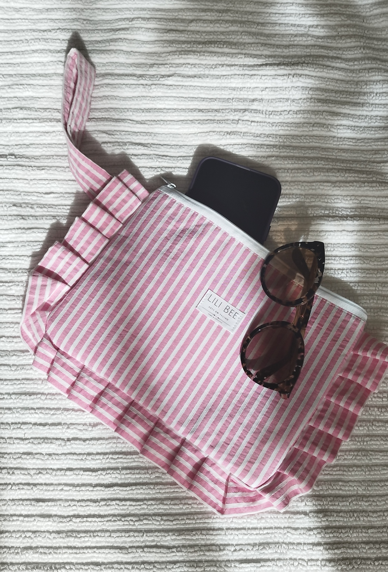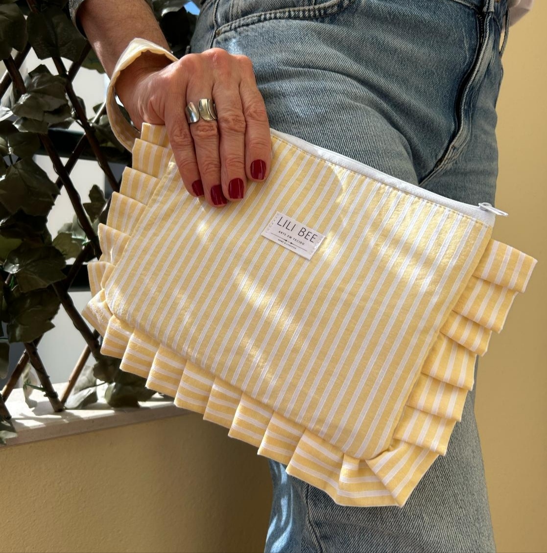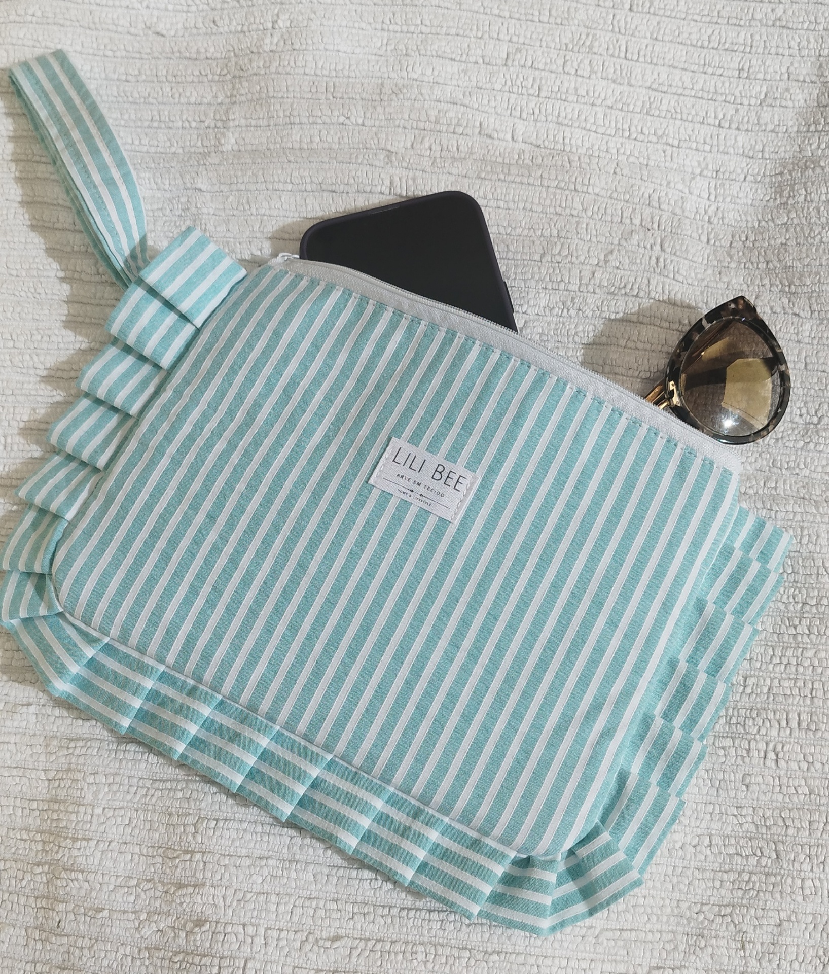Com um toque romântico graças aos delicados folhos, uma clutch para os dias alegres de verão, com uma prática alça de mão fixa, poderá leva-la consigo a todo lado.