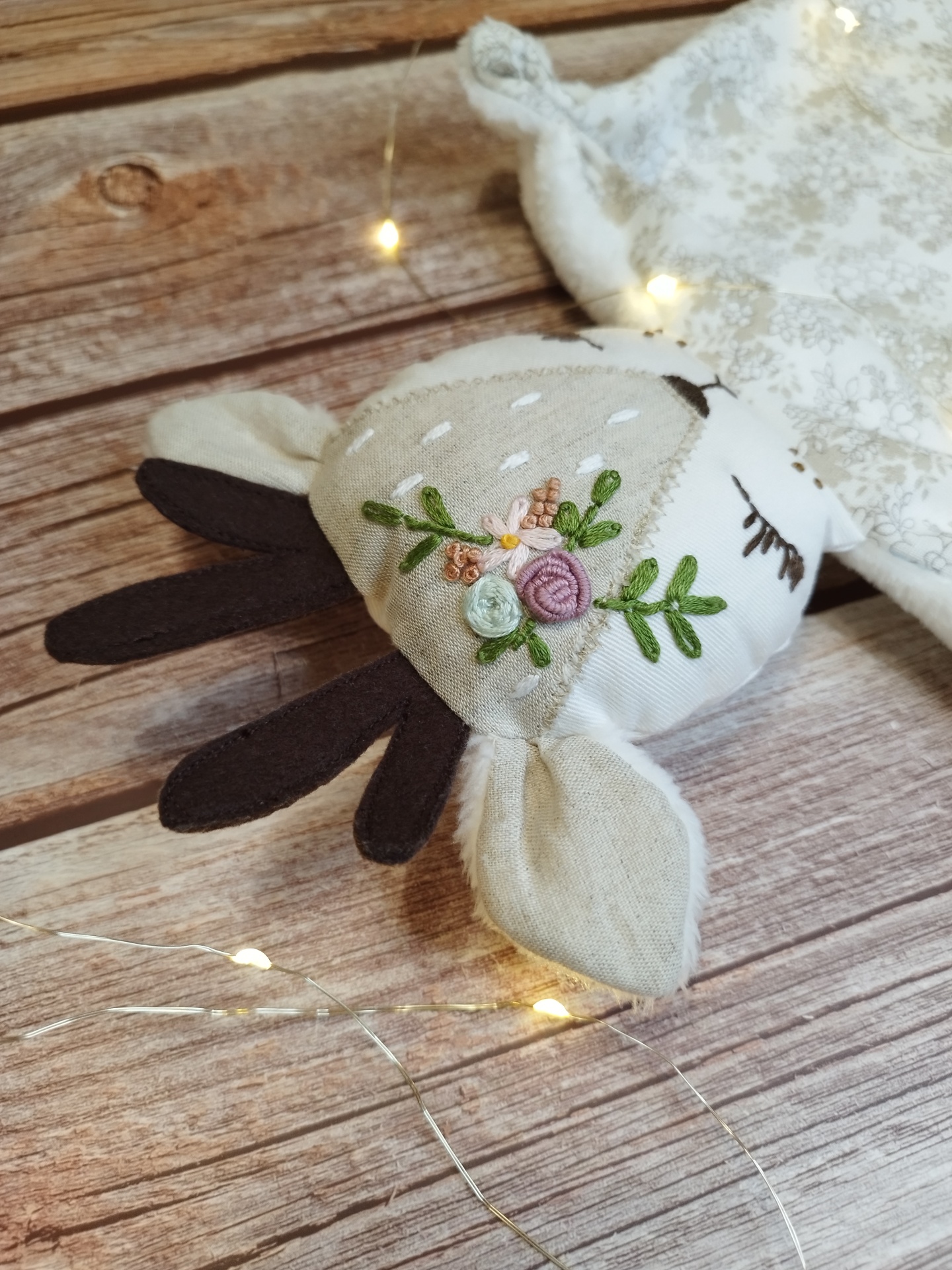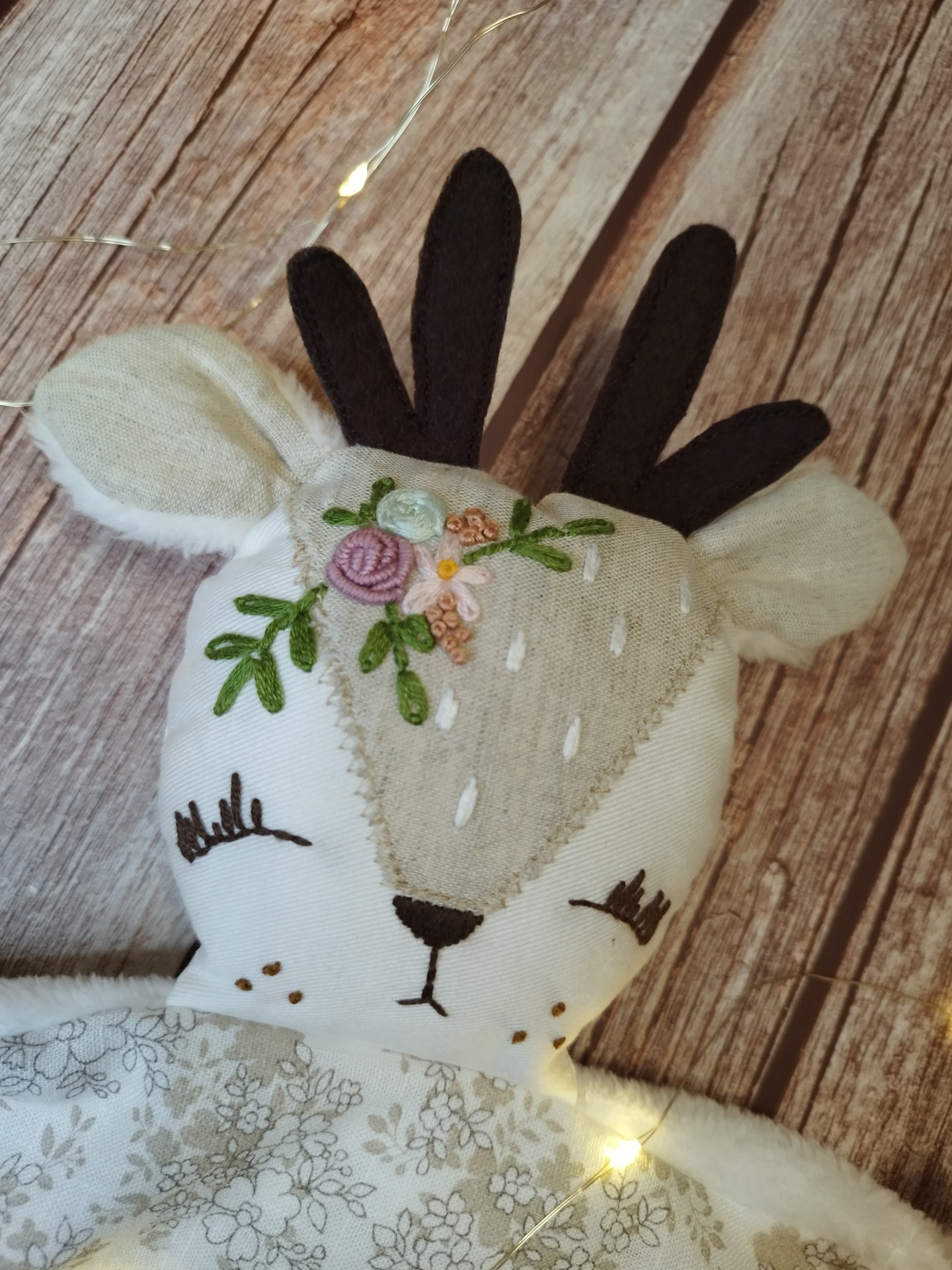 Possui a cabeça amolfadada e a face totalmente bordada à mão, tornando-o uma peça única e muito especial.
