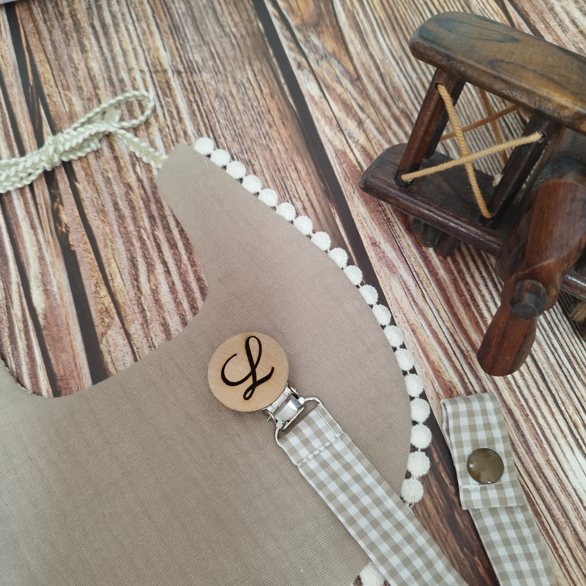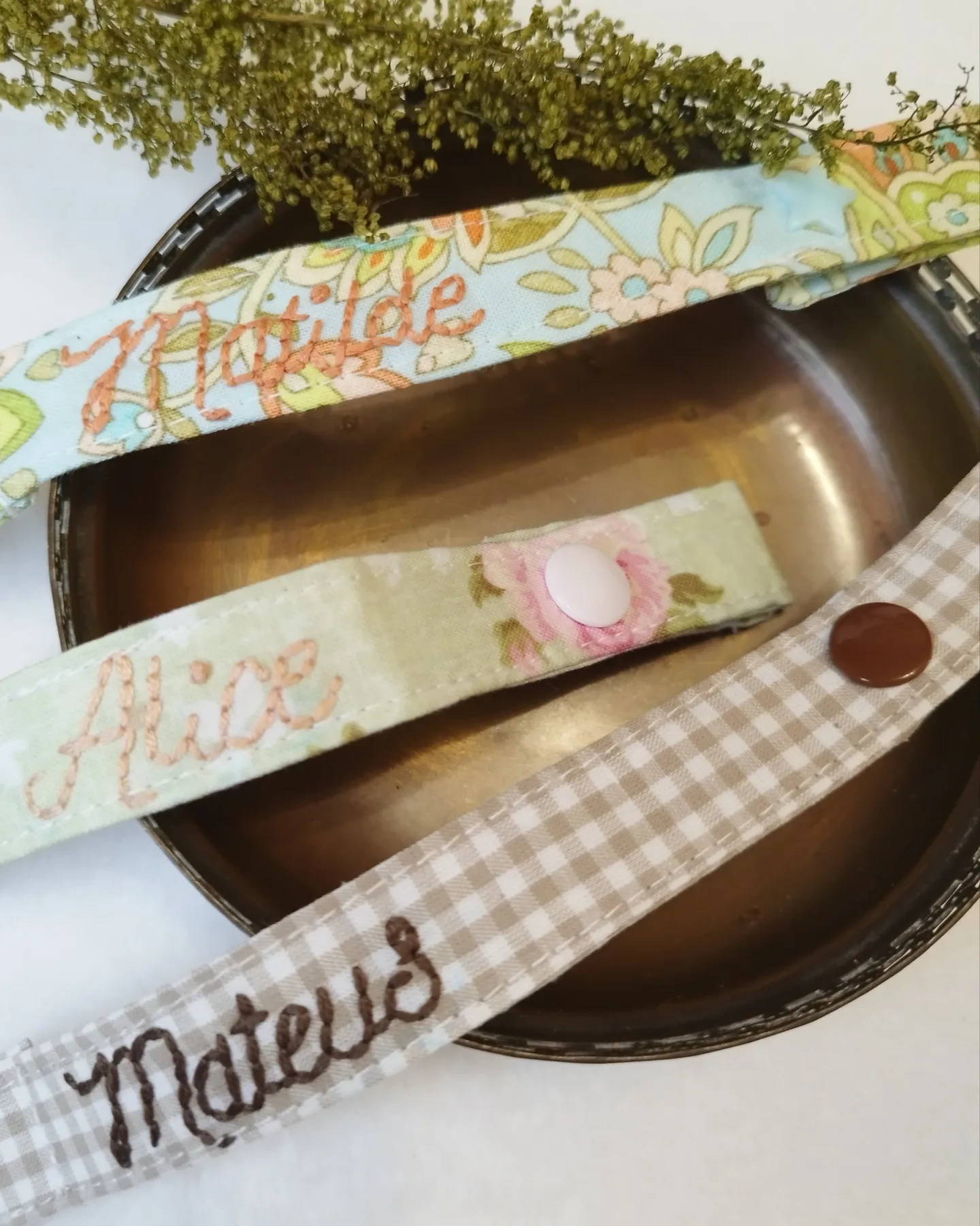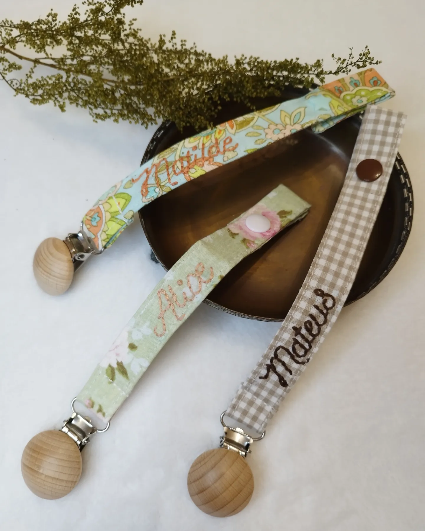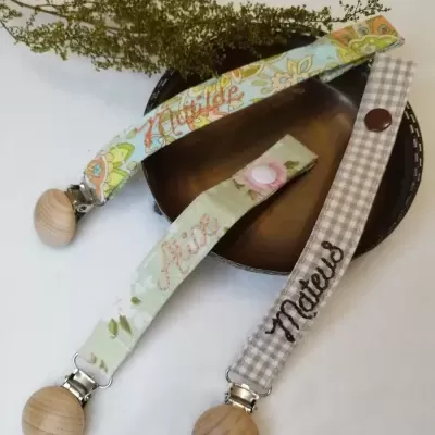 Fita porta-chupetas com mola de madeira, podendo ser personalizada na mola, através de gravação a laser de um desenho ou inicial do nome, ou na fita, com o nome bordado à mão.