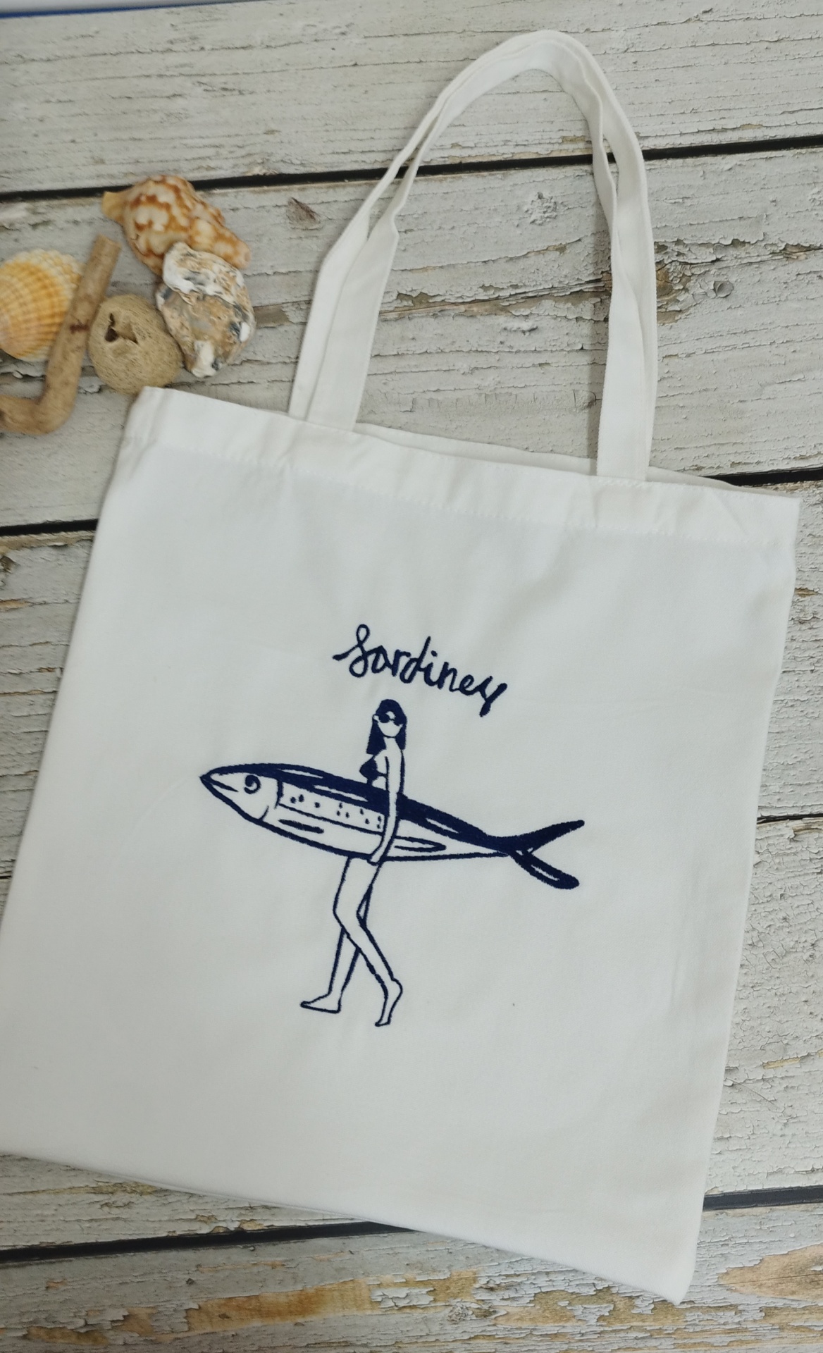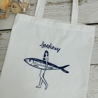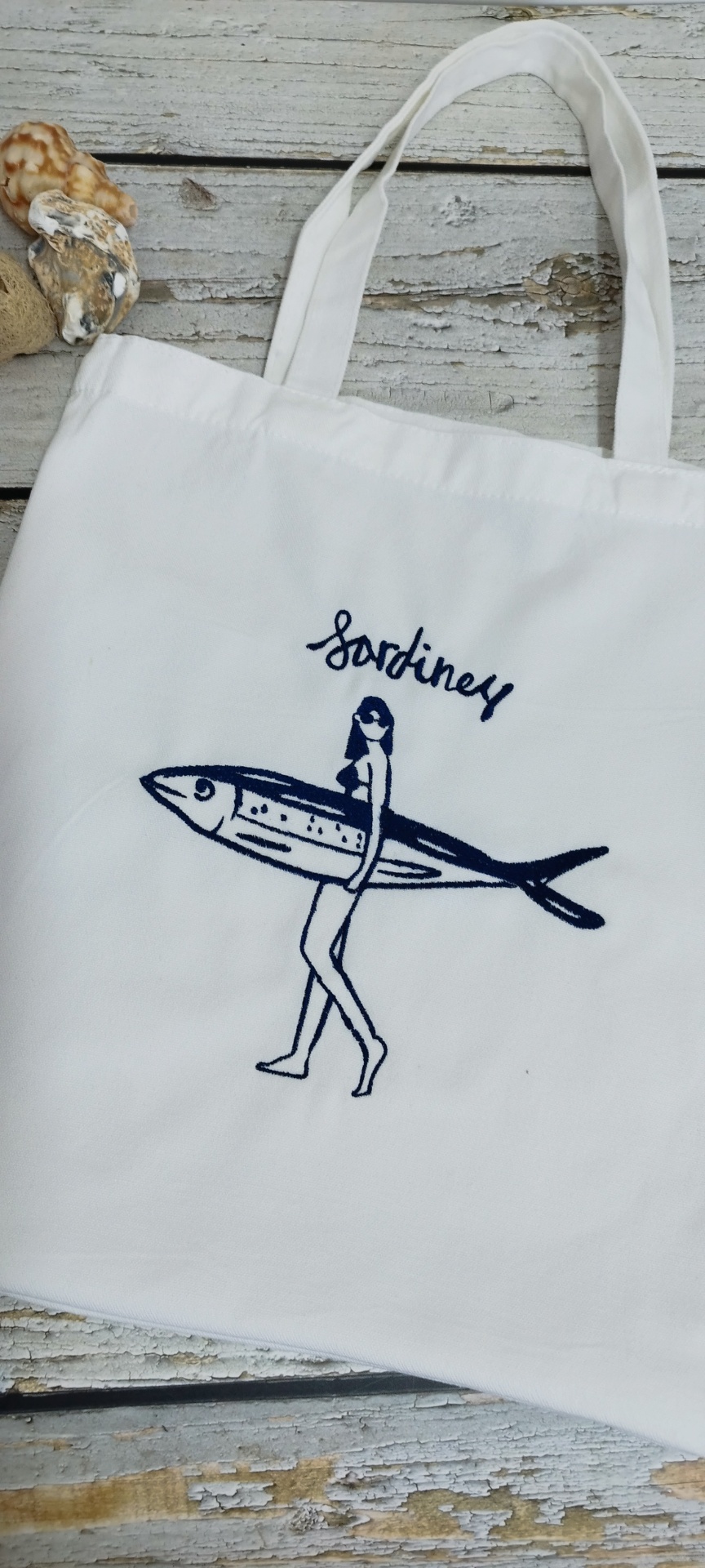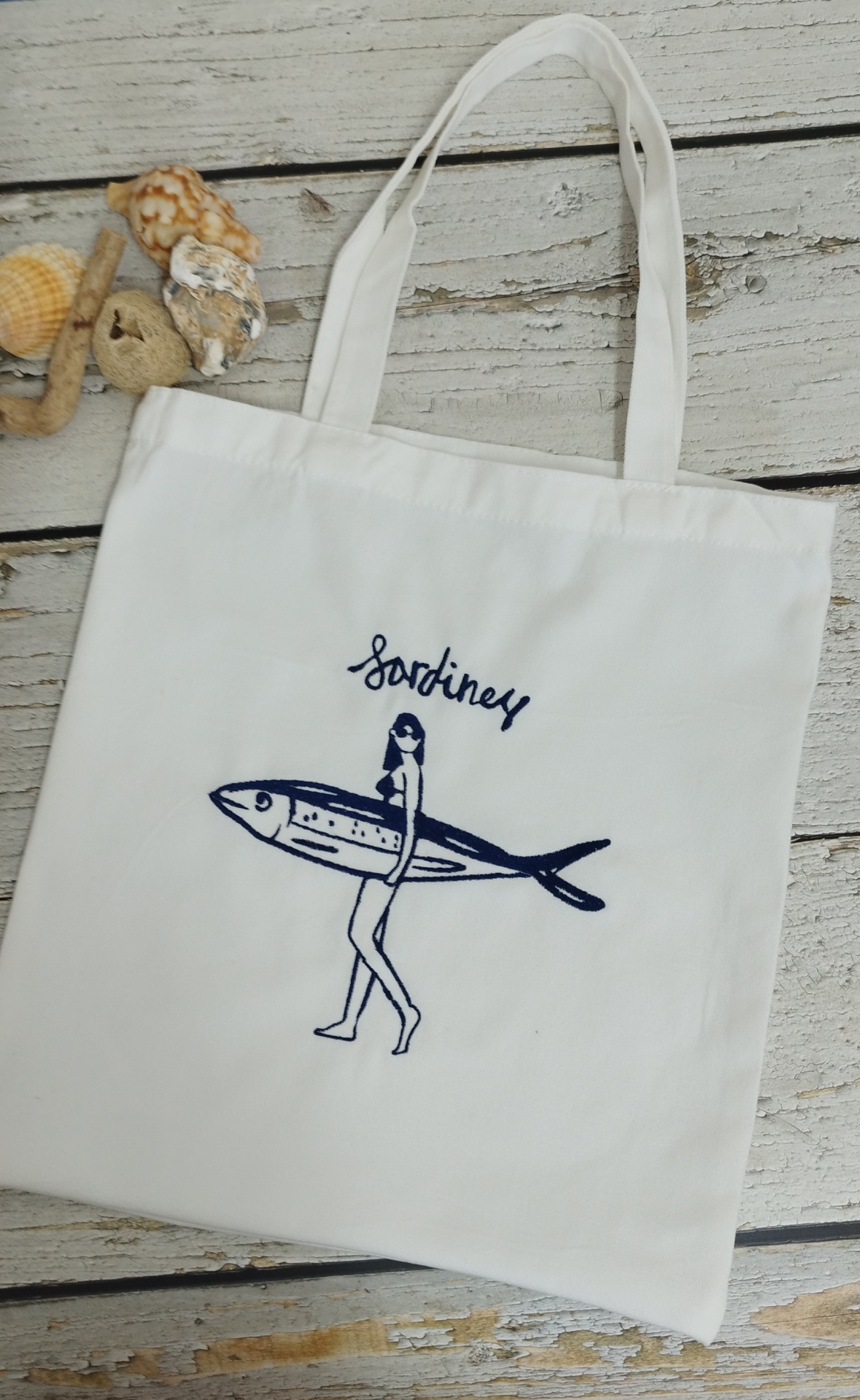 Um Tote Bag incrível, cheia de personalidade e com um bordado super feminino e com alma portuguesa e irreverente. Nada mais incrível do que trocar a prancha de surf por uma sardinha, não acham?